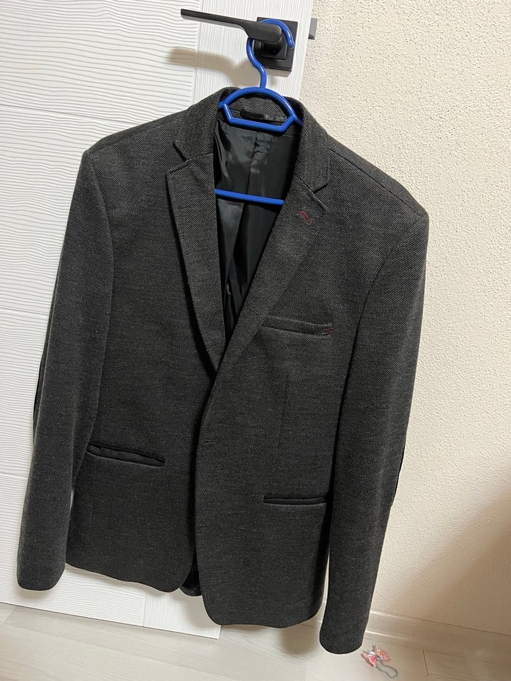 Gri renkte, notch yaka ve düğmeli erkek kumaş ceket. Uzun kollu, normal kesim ve midi boyda, iş ve günlük kullanıma uygun. Sadece düğmesi yok