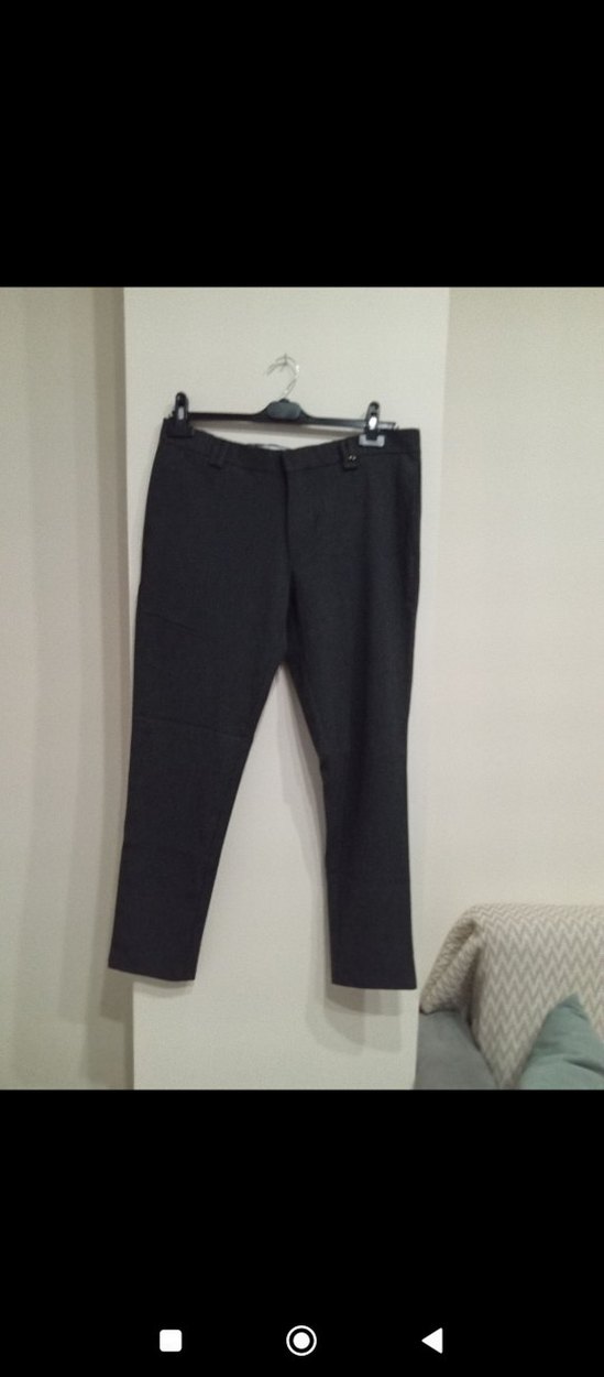 Gri renkli, kemerli bel kumaş pantolon. Ofis kullanımı için uygun, düz desenli ve rahat sentetik kumaştan.sayılı gıyıldı sıfır ayarında