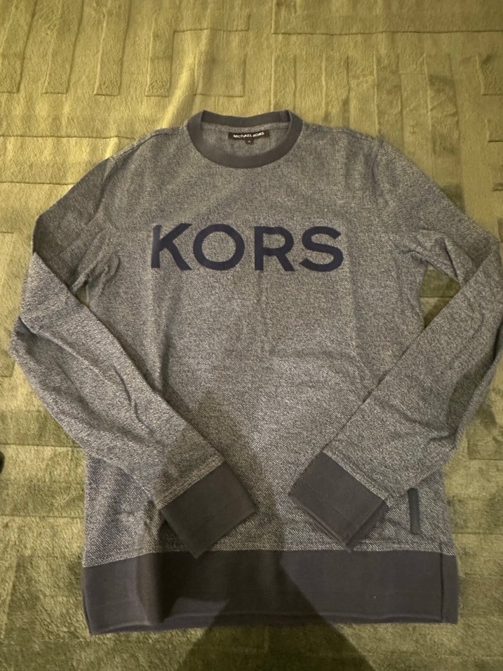 Orjinal Michael Kora erkek Yuvarlak yaka, uzun kollu mavi gri renkli erkek sweatshirt. Önünde "KORS" baskısı bulunur, biraz kullanıldı iyi durumda