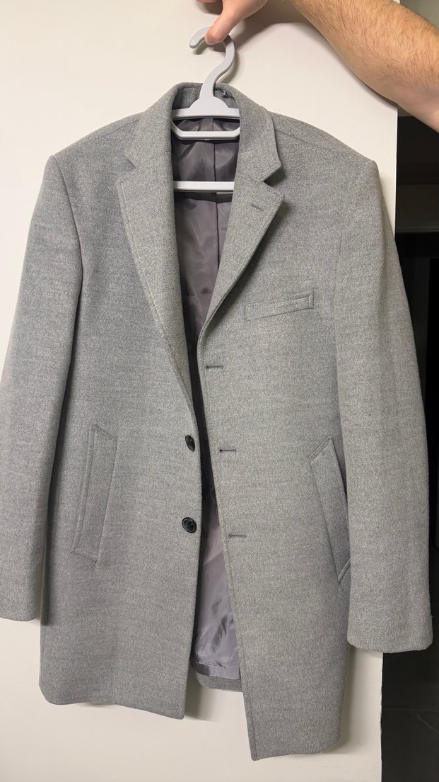 Gri renkte, düğmeli, regular fit midi boy erkek kaban. Notch yaka ve uzun kolludur, sentetik kumaştan üretilmiştir. Ofis ve sokak stili için uygundur.