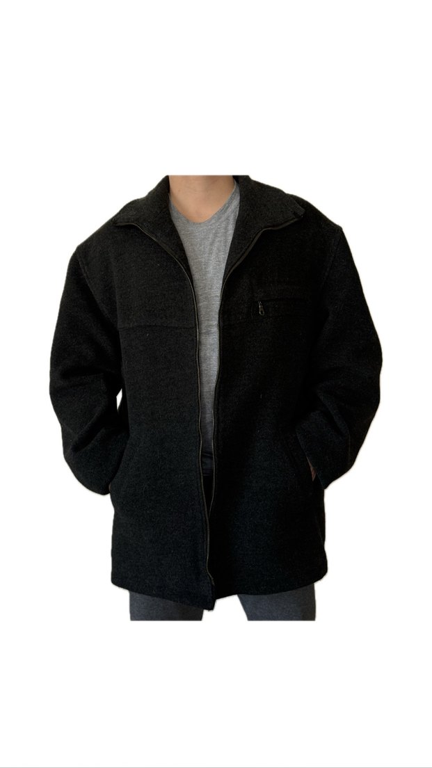 Gri renkte, fermuarlı, notched lapel yakalı, uzun kollu erkek midi boy ceket. Rahat kesim ve günlük kullanıma uygun, sokak modası tarzında. Fermuarı bozuk tamir edilebilir.
