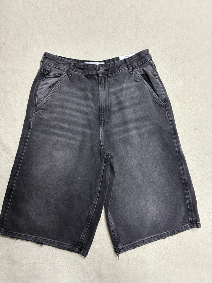 Gri renkte, midi boyda ve bol kesimli denim şort. Günlük kullanıma uygun, rahat ve şık bir tarz sunar.