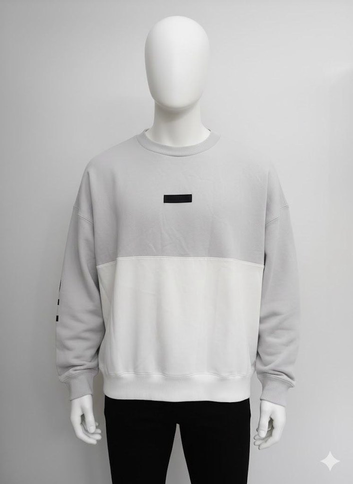 Gri ve beyaz renk bloklu, yuvarlak yaka ve uzun kollu erkek midi sweatshirt. Rahat kesimli, yumuşak ve sıcak kumaştan üretilmiştir.