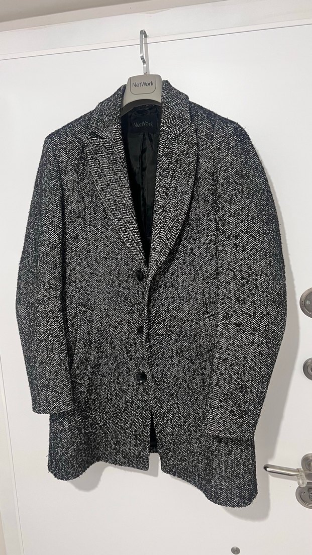 Gri renkte, yün kumaştan üretilmiş, notched lapel yakalı, düğmeli ve normal kesime sahip midi uzunlukta erkek kaban. Ofis ve günlük kullanıma uygundur.