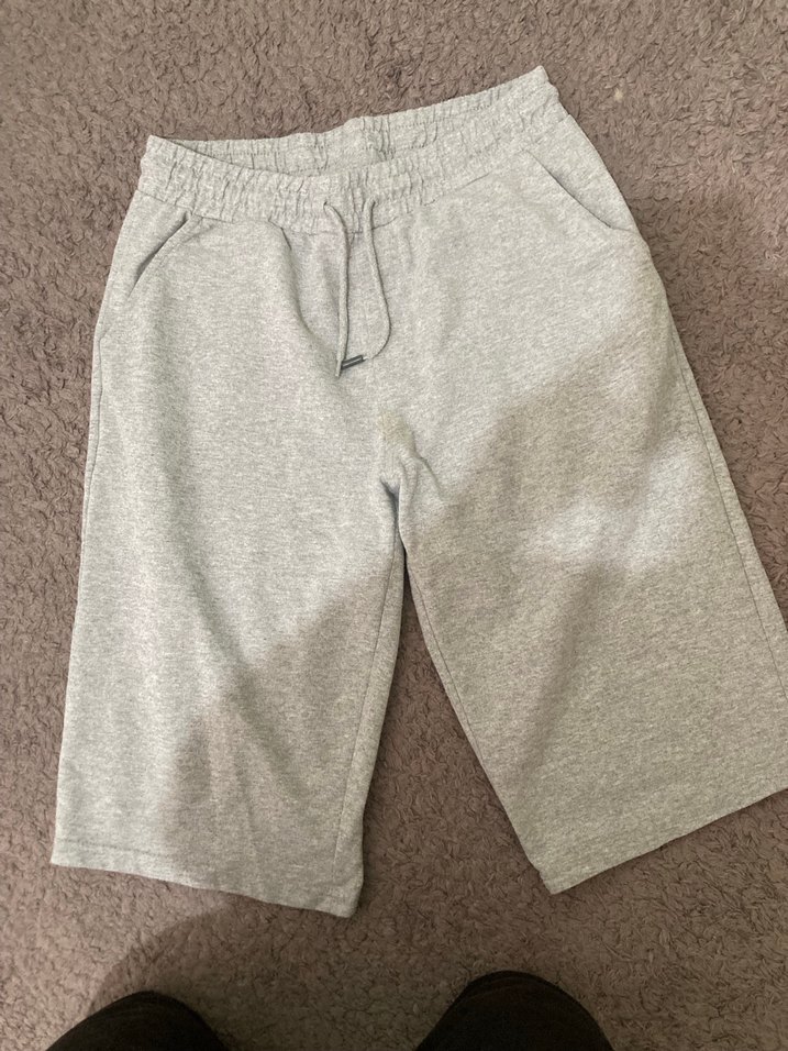Pamuklu, gri renkte, bol kesim mini eşofman altı. Elastik beli ve cepleriyle rahat, günlük sokak stili için uygun.