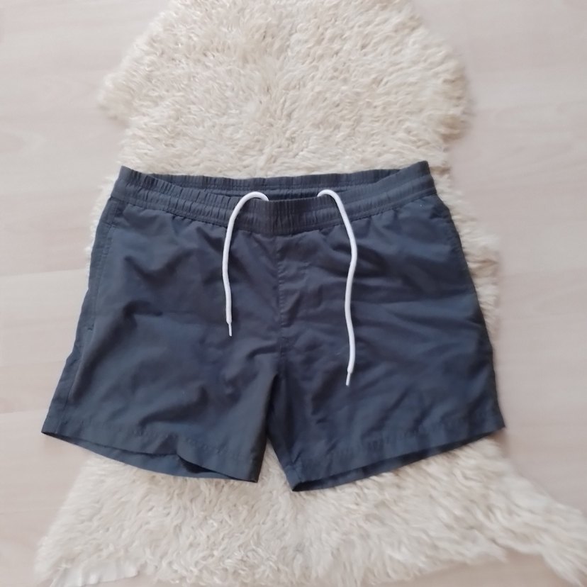 Gri renk, beyaz bağcık detaylı, rahat kesim erkek mini şort mayo, plaj ve günlük kullanıma uygun.