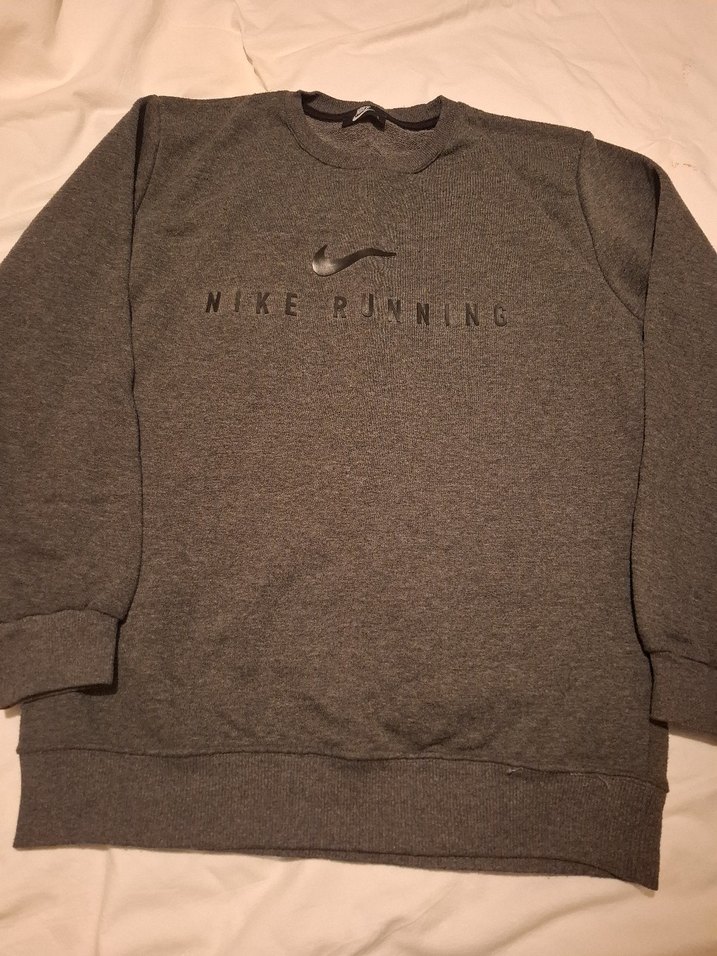 Gri renkli Nike Running baskılı, yuvarlak yaka, uzun kollu erkek sweatshirt. Yumuşak, örgü dokulu kumaştan rahat ve bol kesim. Günlük kullanıma uygun sokak stili ürünü.