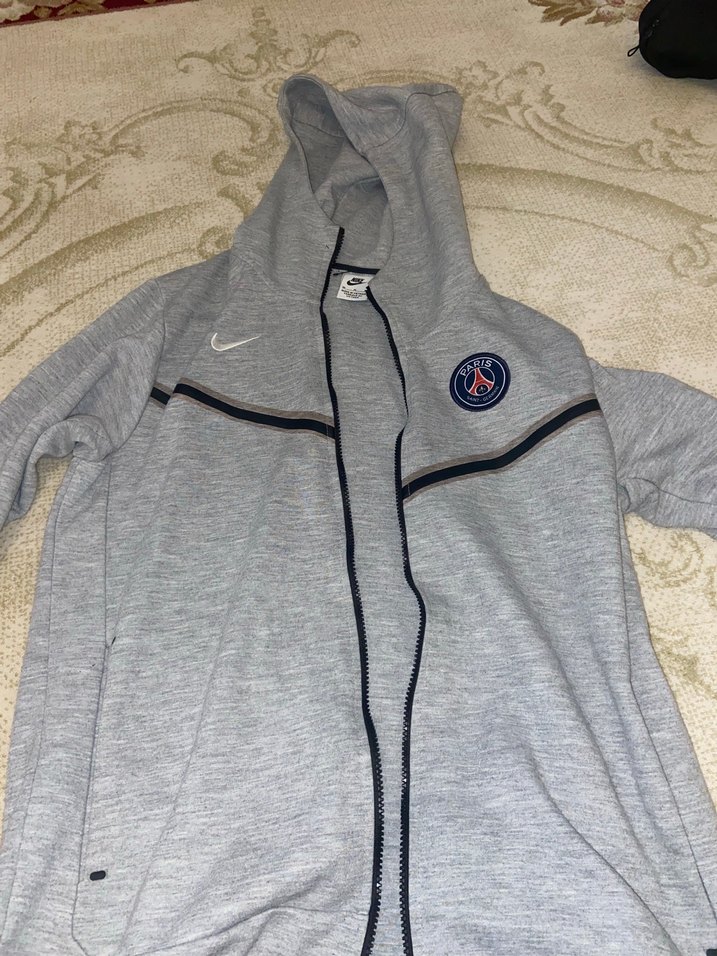 Gri renkli, fermuarlı kapüşonlu erkek, uzun kollu ve bisiklet yaka ile tasarlanmıştır. Yumuşak kumaştan olup baskılı detaylara ve sportif tarza sahiptir. Orjinal Nike tech çok az giyildi