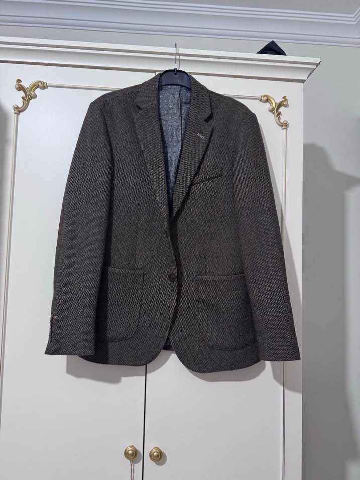 Gri renkte, düğmeli ve normal boyda erkek ofis takımı ceketi. Uzun kollu ve klasik yakalı, rahat kesimlidir.