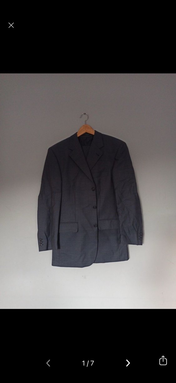 Gri renkte, uzun kollu ve yaka detaylı erkek takım elbise. Düğmeli ve normal kesim, ofis kullanımı için uygundur. ️