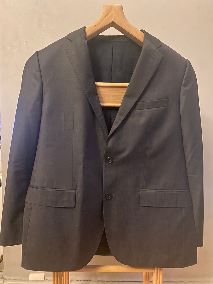 Gri renkli erkek takım elbise ceketi, keskin yaka, uzun kollu ve düğmeli ön tasarıma sahiptir. Normal boy ve klasik kesimlidir, iş ortamları için uygundur. ️