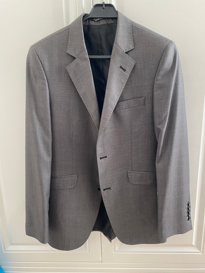 Gri renkli erkek takım elbise ceketi, kesik yaka, düğmeli ön, uzun kollu ve normal boydadır. Ofis kullanımı için modern klasik stil sunar. ️