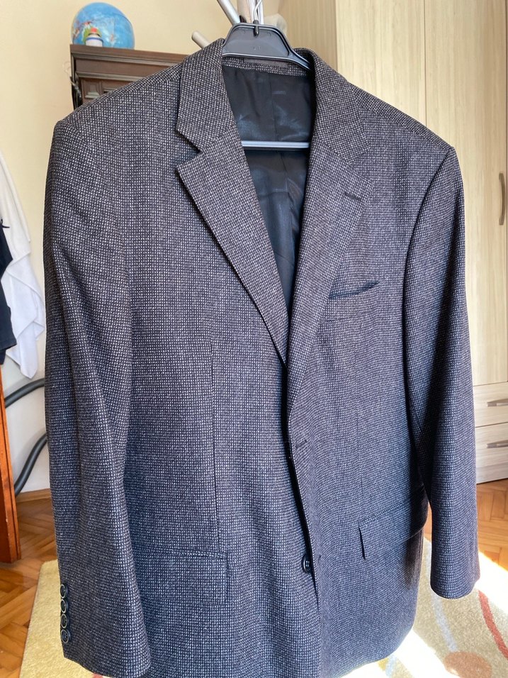 Gri renk, düğmeli, klasik kesim erkek ofis takım elbise ceketi. Uzun kollu ve normal boyda, iş ortamına uygun.