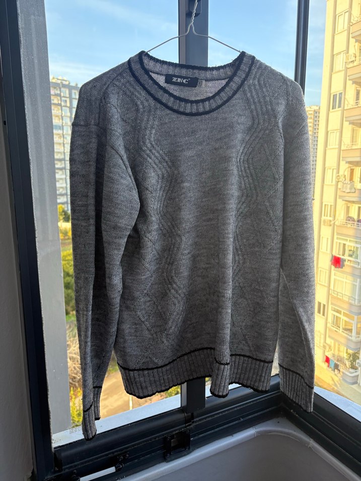 Gri renkli, bisiklet yakalı, uzun kollu ve salaş kesimli örme erkek kazak. Günlük kullanıma uygun rahat bir sokak stili sunar.