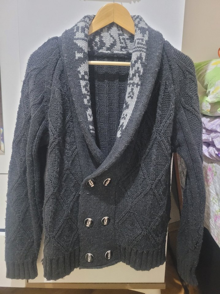 Gri renkli, çift düğmeli ve yaka detaylı erkek örgü hırka. Fitted kesim, uzun kollu ve günlük sokak tarzı için uygun. M-L beden uyumludur