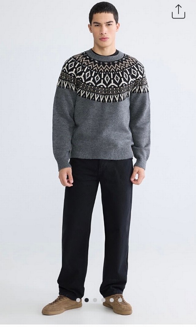 Gri renkli, örgü kumaştan yapılmış, yuvarlak yakalı ve uzun kollu erkek kazak. Rahat kesim ve normal uzunluktadır. Günlük kullanıma uygundur.