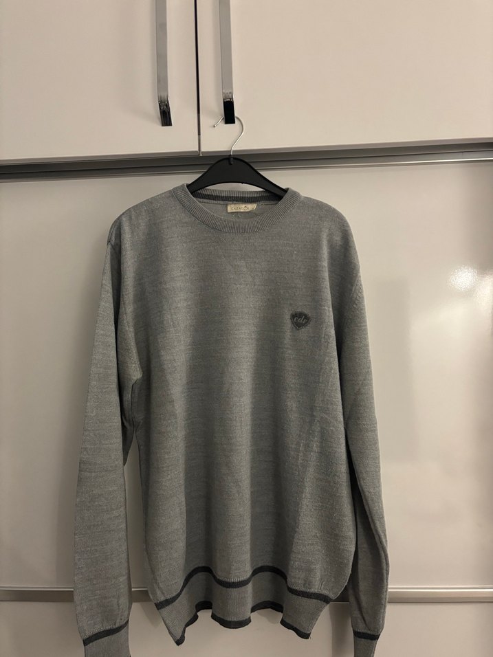 Gri renkli, uzun kollu ve yuvarlak yakalı erkek örgü yün kazak. Bol kesimi ve minimalist tarzıyla günlük kullanıma uygundur.