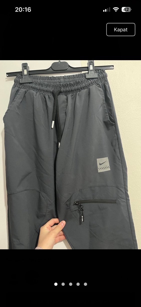 Gri renkli, bol kesim erkek eşofman altı, fermuarlı cepleri ve lastikli beliyle rahat günlük kullanım için sentetik kumaştan üretilmiştir.