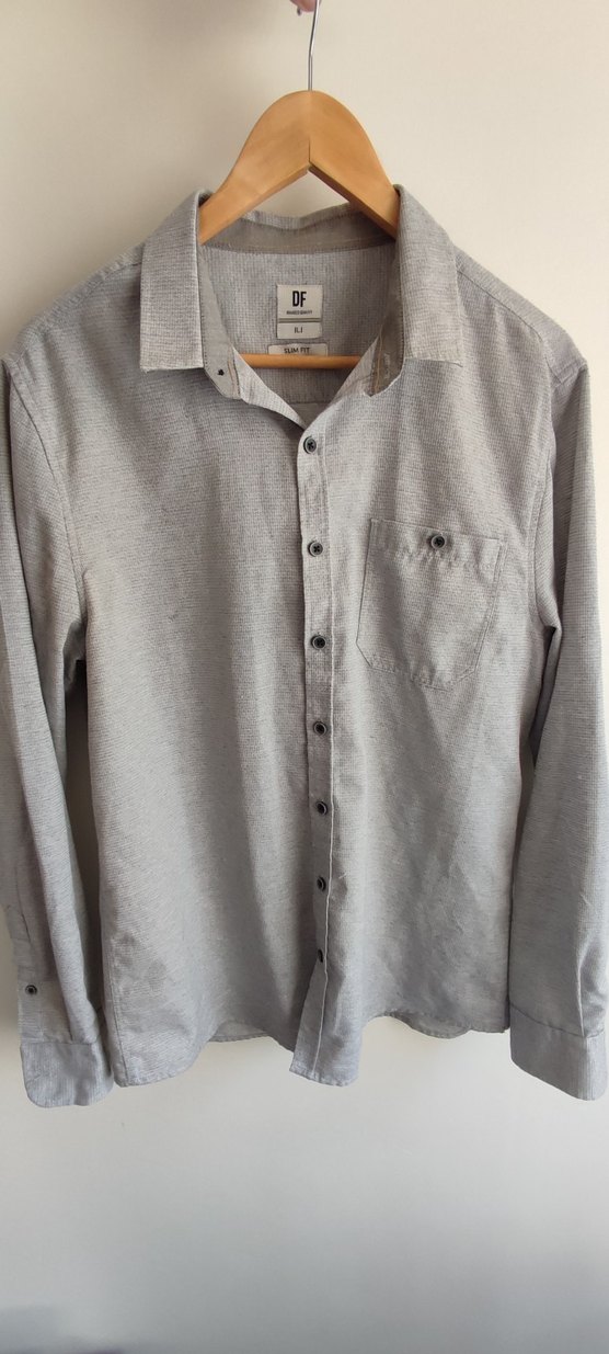 Gri renkli keten erkek gömlek, uzun kollu ve düğmeli. Yaka kısmı klasik ve dar kesimlidir, günlük giyim için uygundur. Az kullanılmış ve defosuzdur.