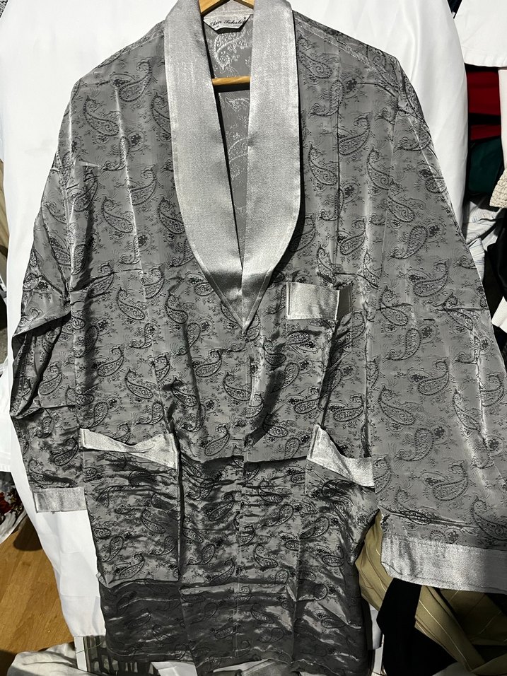 Gri renkte, drapeli notch yaka ve uzun kollu erkek pijama takımı. Regular kesim ve vintage tarzda, parlak dokulu kumaş kullanılmış.