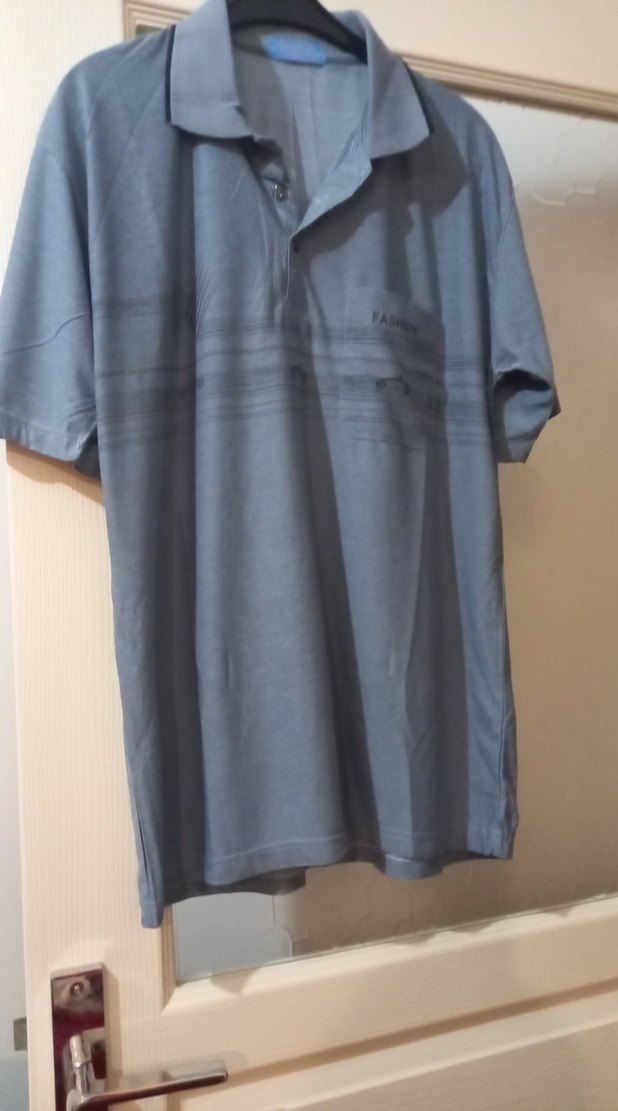 Gri renk, yakalı ve kısa kollu, bol kesim erkek polo tişört. Yumuşak sentetik kumaştan, rahat sokak stili için uygundur.