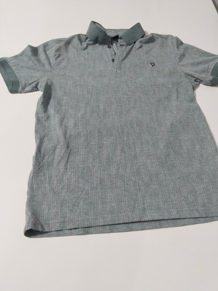 Gri renkte, düğmeli yakaya sahip kısa kollu erkek polo tişört. Sentetik kumaştan, rahat kesimli ve günlük kullanım için uygundur. Desensiz ve normal boyda.