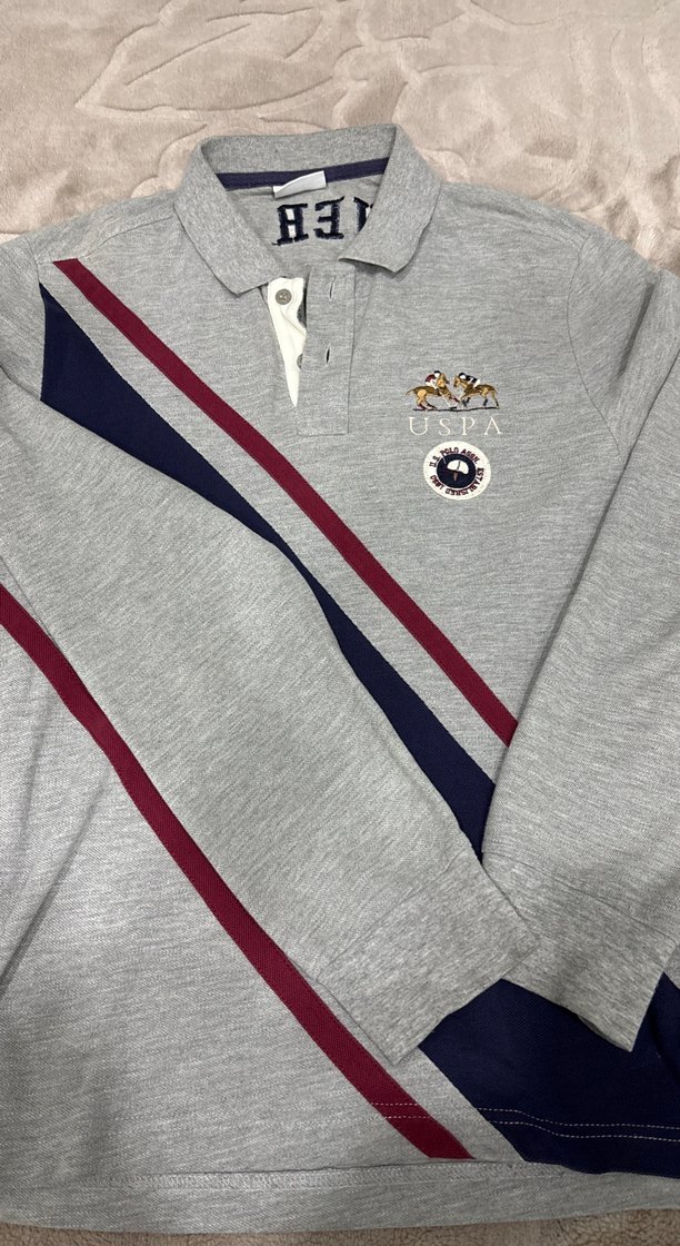 Gri renkli, uzun kollu, düğmeli yakalı erkek polo tişört. Baskılı çizgiler ve rahat kesimiyle günlük ve spor tarz için uygundur.