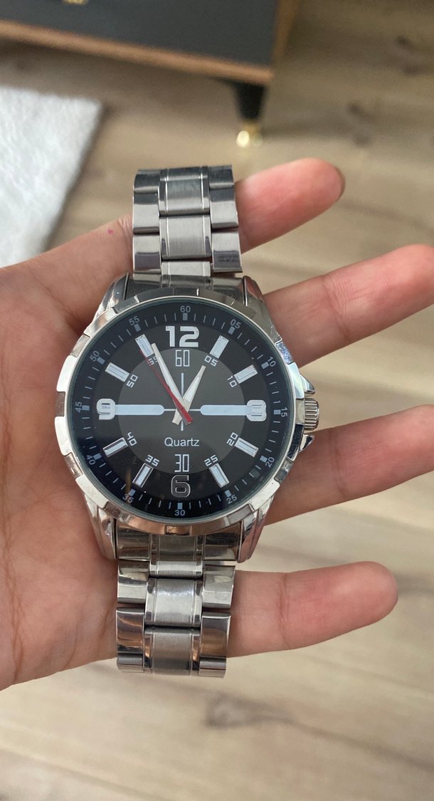 Gri kadranlı ve quartz mekanizmalı, paslanmaz çelik kayışlı, modern iş tarzı erkek saati. Hiçbir defosu yoktur kullanışlı şık bir saat