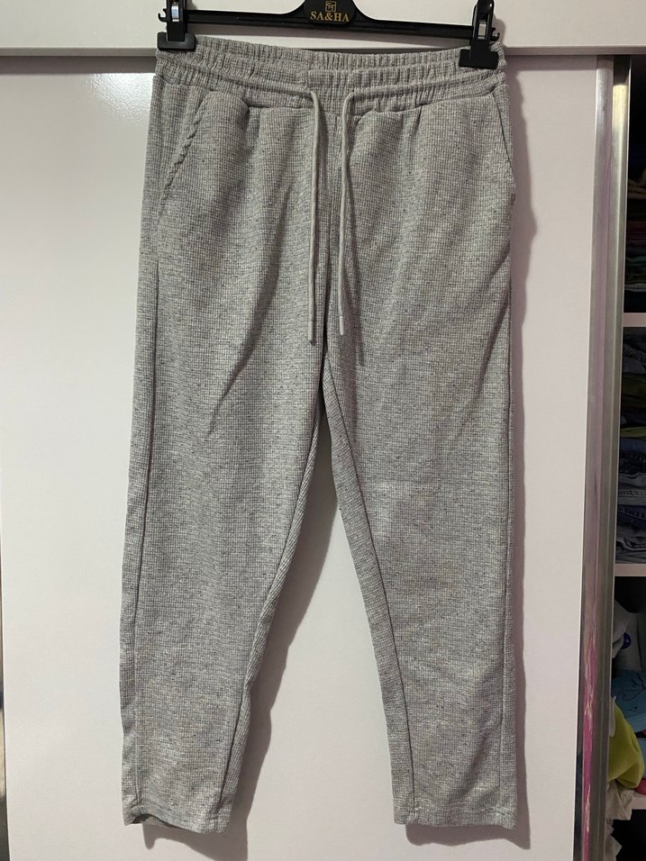Gri renkte, keten kumaştan, rahat kesim ve normal boyda erkek eşofman. Lastikli bel, bağcıklı ve yan cepli, spor için uygun rahat stil sunar. ♀️ Boy 92 cm