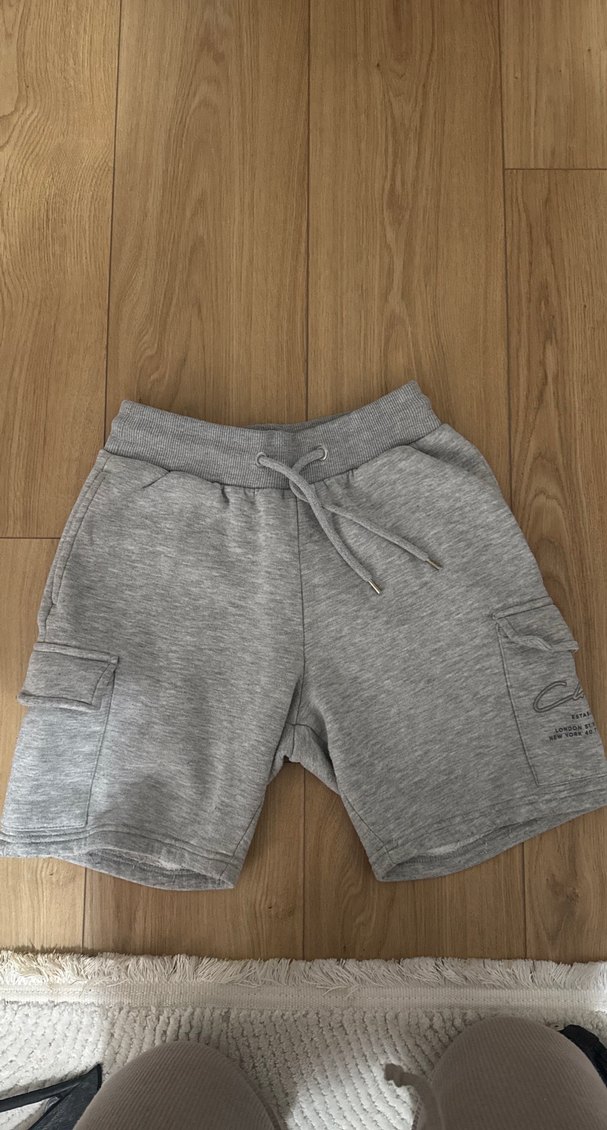 Gri renkli, rahat kesim erkek şortu. Yan cepler ve belden bağlamalı, yumuşak ve sıcak kumaştan üretilmiştir. Desensiz, sokak stili için uygun.