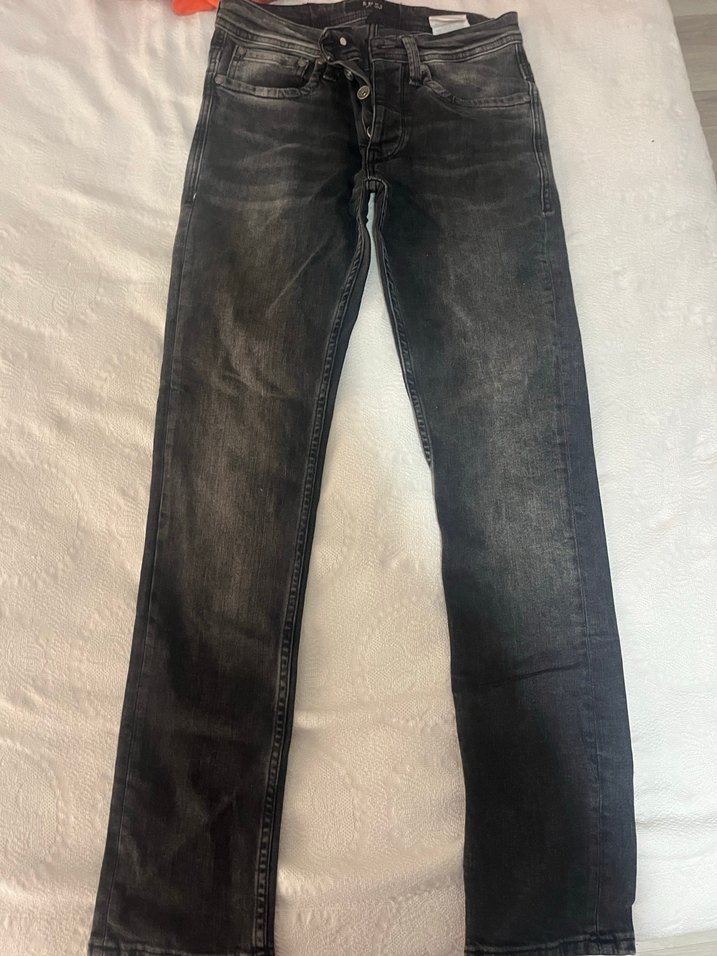 Gri renkte regular fit erkek jean, düğmeli ön kapama ve normal boyda denim kumaştan. Günlük sokak stili için uygundur.
