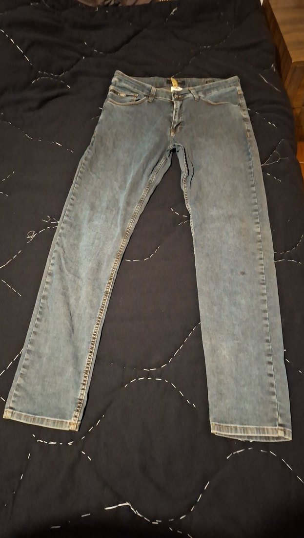 archiles marka kirli mavi gri renkte regular fit ve normal boyda erkek denim pantolon tokalı detay içerir sol diz kısmında küçük lekesi var onun dışında temiz ürün