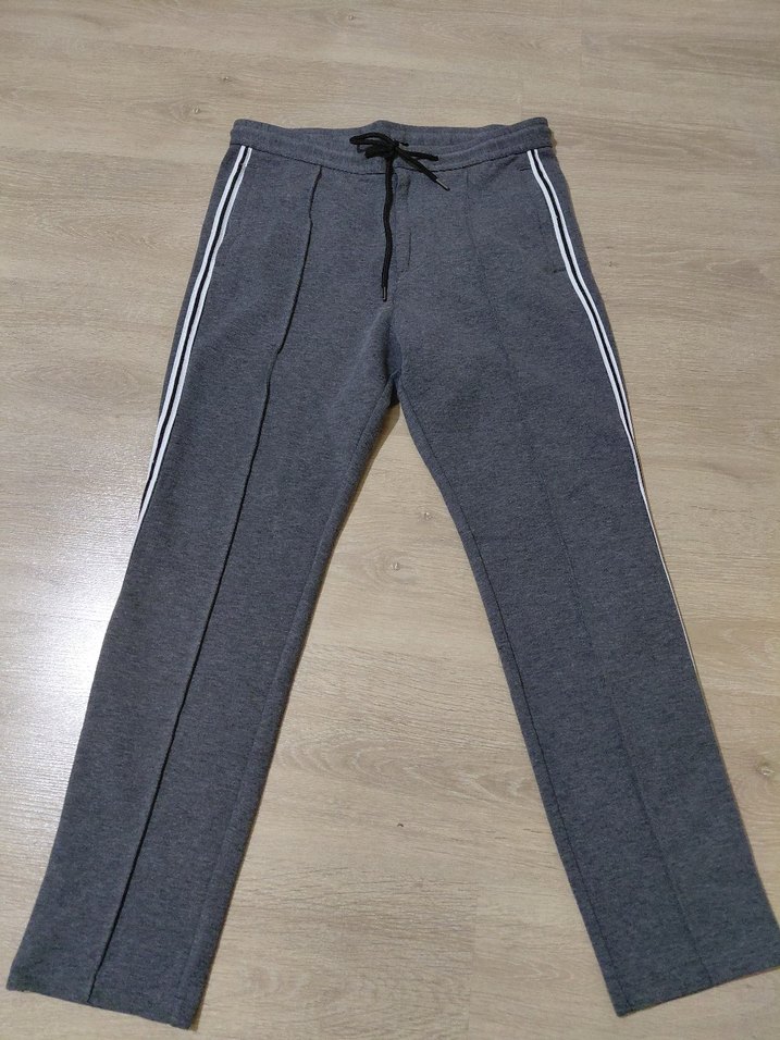 Gri renkli, regular fit erkek eşofman altı, elastik bel ve bağcıkla rahat kullanım sunar. Yumuşak sentetik kumaştan, yan şerit detaylı, günlük kullanıma uygun.