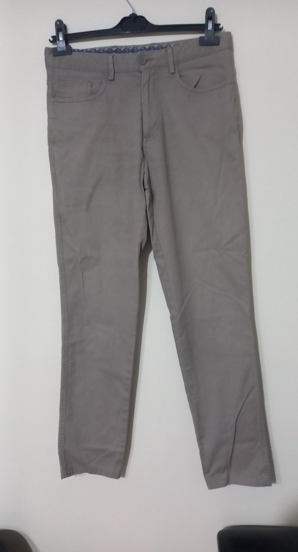 Gri renk, regular fit ve normal boyda erkek pantolon. Yumuşak sentetik kumaştan, desen içermeyen sade tasarım. Günlük dış mekan kullanımı için uygundur. açık toprak rengi belden boyu 106 bel 40 cm tahmini 32 beden erkek için fakat çok temiz pantolon