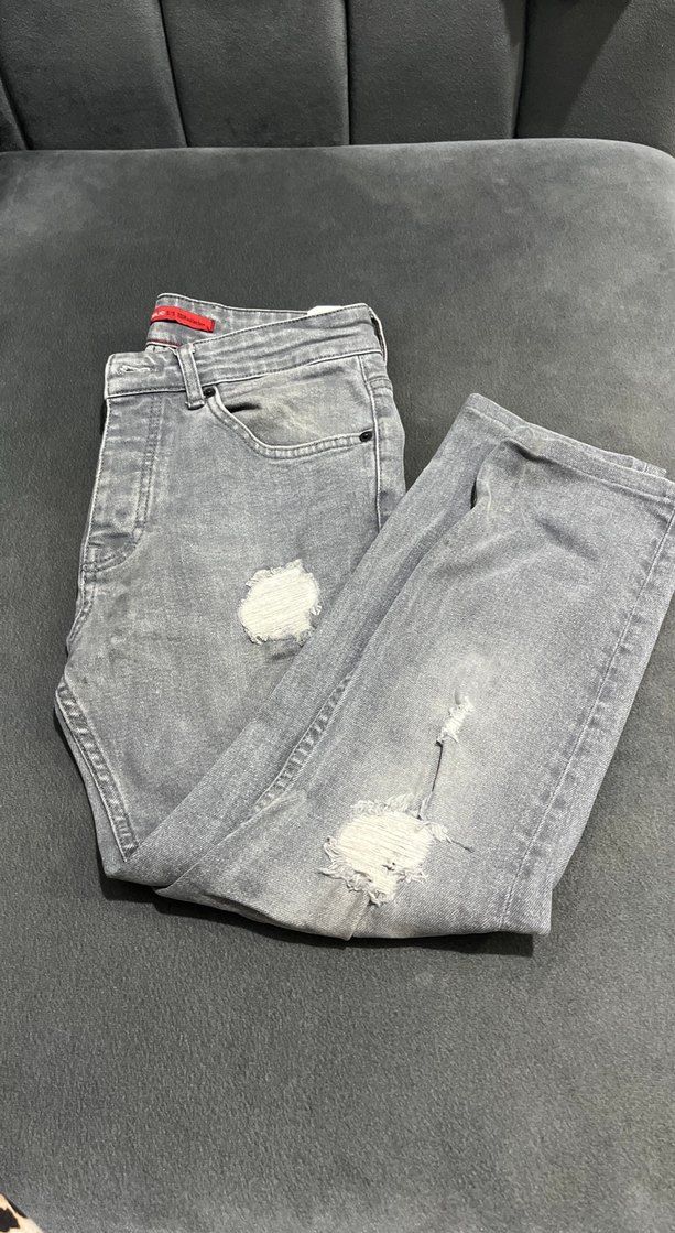 Gri renkte, salaş kesimli denim jean. Günlük kullanıma uygun, hafif yırtık detaylarıyla rahat ve şık görünüme sahip.