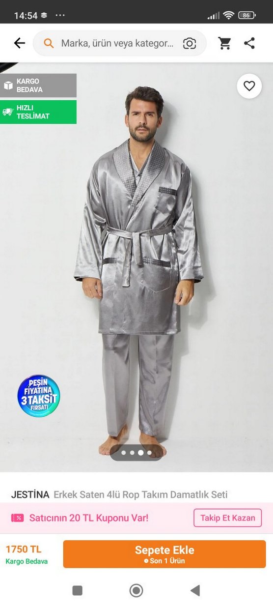 Gri renkte, regular fit saten erkek sabahlık. Belden bağlamalı, yakada ve ceplerde hafif desenli detaylar bulunur. Rahat ve şık bir kullanım sunar. ceyizde almıştık hiç kullanilmadi, üçlü takım