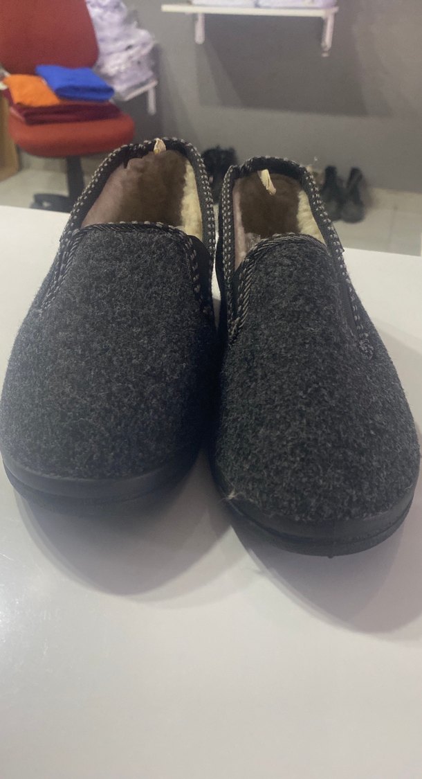 Klasik tasarıma sahip gri erkek ev terliği, iç kısmı yumuşak ve sıcak kürk detaylıdır.