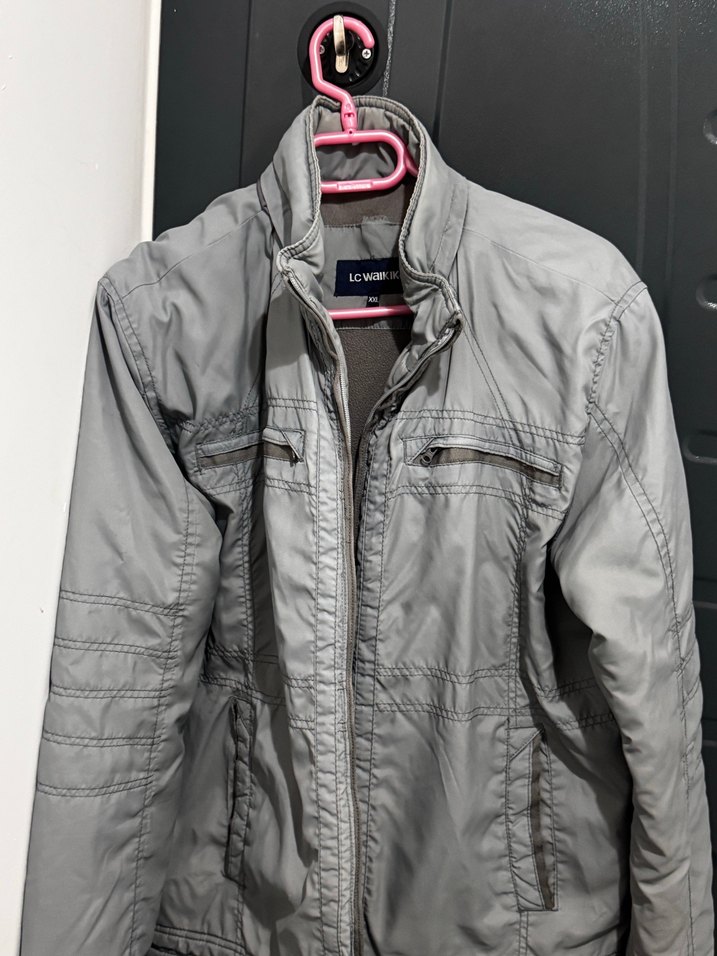 Gri renkte, fermuarlı önü ve kesilmiş yaka detaylı, sentetik kumaştan yapılmış erkek sokak stili ceketi. Uzun kollu ve normal midi boyda, günlük kullanıma uygun rahat kesim.
