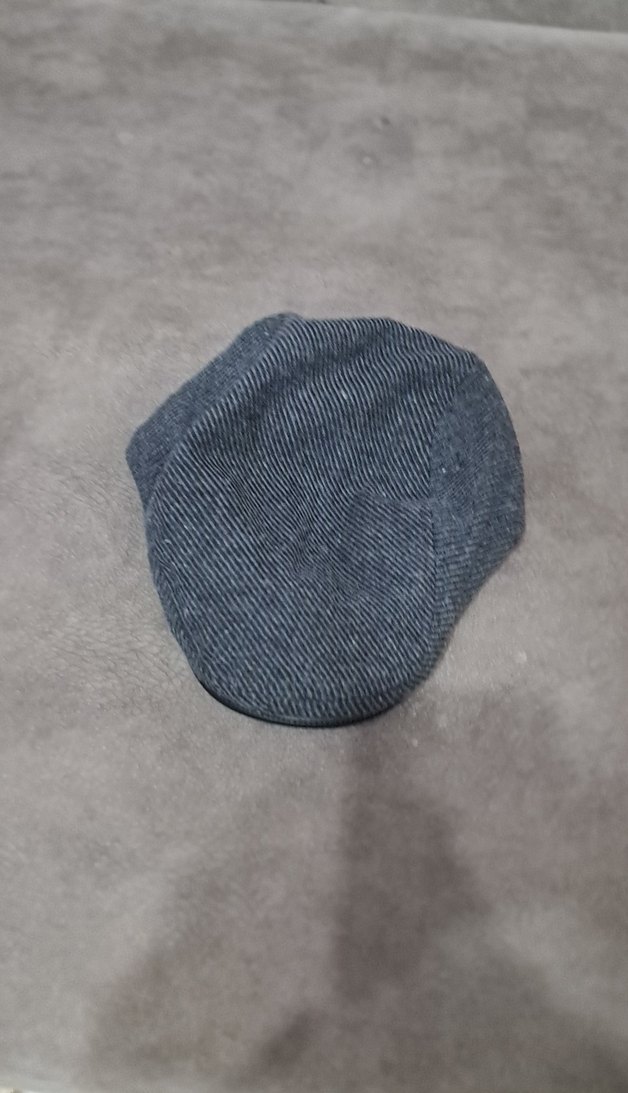 Gri renkli, çizgili kumaştan yapılmış erkek şapkası. Rahat ve sokak stili görünümüyle soğuk günler için uygun.
