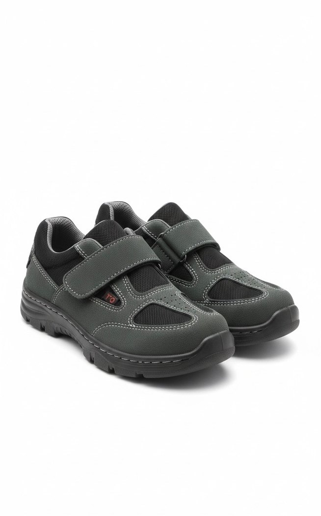 Gri renkli, bantlı ve kauçuk tabanlı erkek spor tarzı outdoor ayakkabısı. Rahat ve şık günlük kullanım için uygun.
