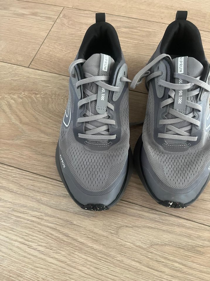 Gri renkli, bağcıklı erkek koşu ayakkabıları kauçuk tabanlı, spor için rahat ve sade bir tasarıma sahiptir.