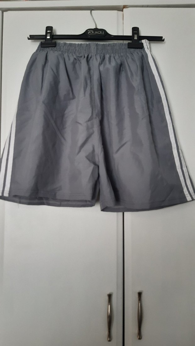 Gri renkte, bol kesim, elastik bel bantlı, hafif sentetik kumaştan yapılmış erkek spor şortudur.