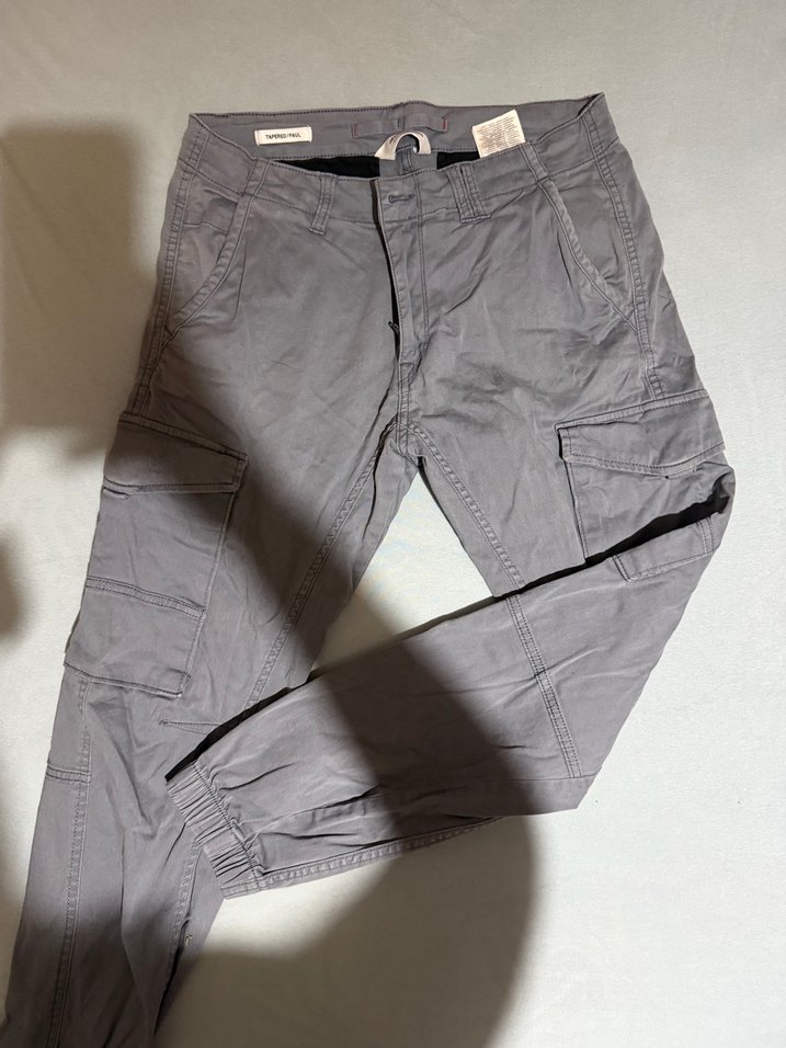 Gri renk, bol kesim, kemerli erkek kot pantolon. Midi boyda, sokak tarzı ve açık hava kullanımı için uygundur. Rahat ve gündelik tarzda. 30-32