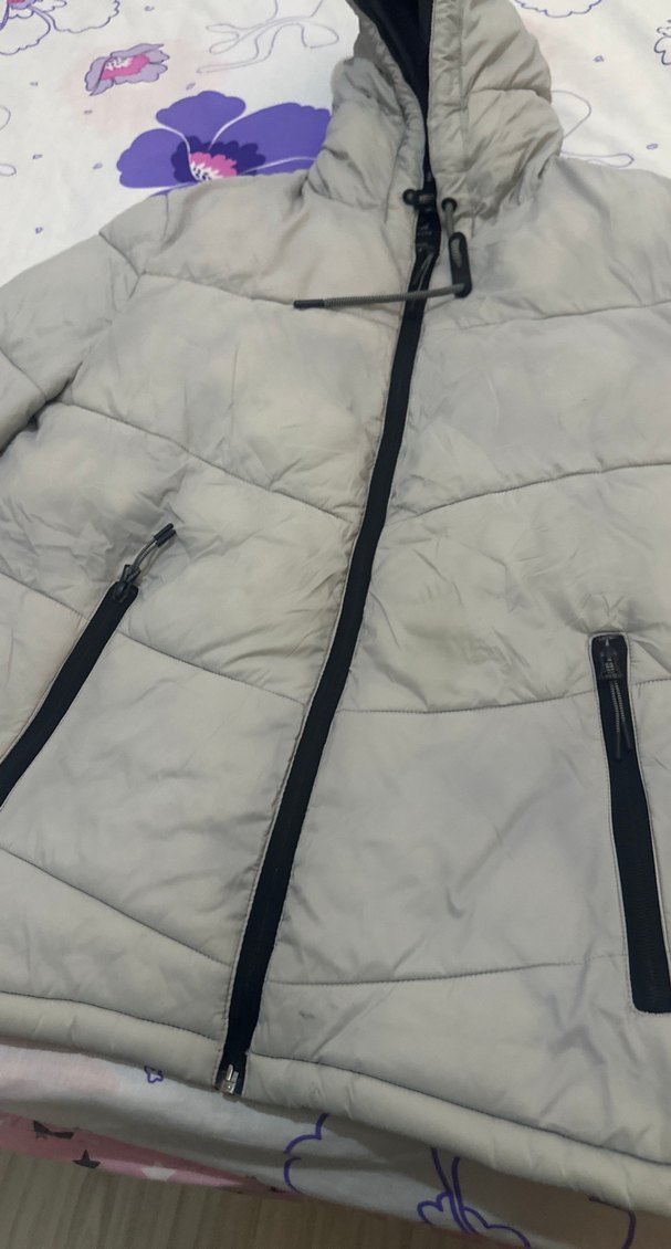 Gri renkte, siyah fermuar detaylı, yüksek yakalı, dolgu kumaştan yapılmış erkek street wear mont.