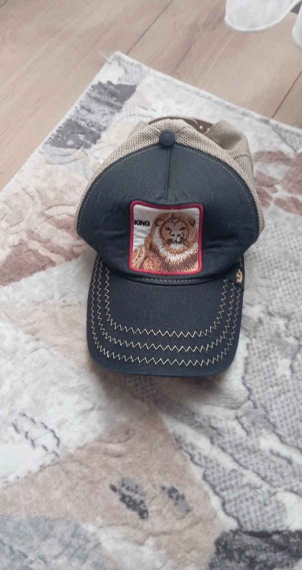 Gri renkli erkek street wear şapka, aslan işlemeli ve file detaylı olup athleisure tarzını yansıtır.