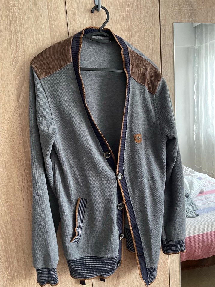 Gri renk, notched lapel yakalı ve düğmeli erkek hırka. Süet omuz detaylarıyla uzun kollu ve normal kesimdir, günlük kullanıma uygundur.