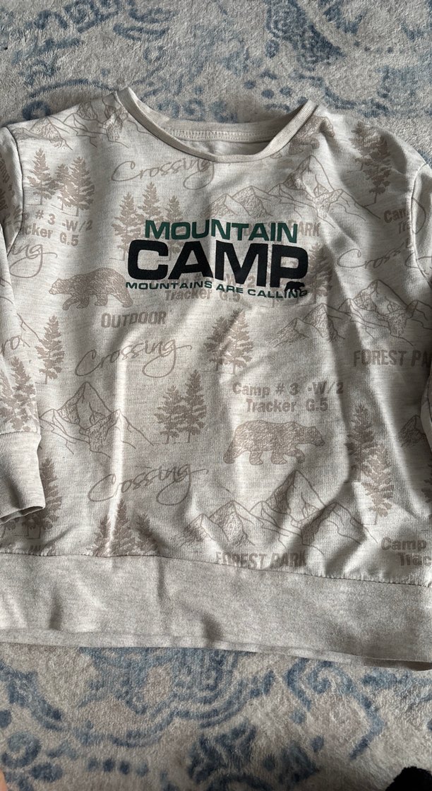 Gri renkli, uzun kollu ve yuvarlak yaka erkek sweatshirtü, yumuşak kumaştan ve bol kesimdedir. Üzerinde 'MOUNTAIN CAMP' yazılı baskılar ve doğa temalı desenler bulunur. ️