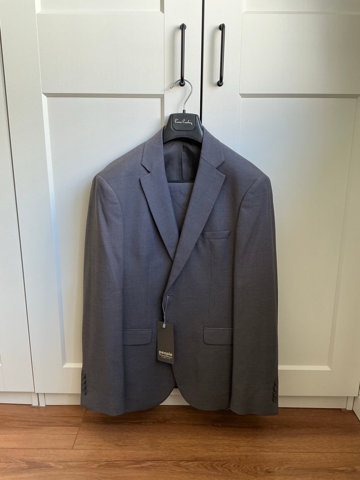 Gri renkli, düğmeli ön kısmı ve kesik yaka detaylı erkek ofis takım elbisesi. Rahat kesim, uzun kollu ve modern klasik tarzda, iş ortamları için uygundur. ️
