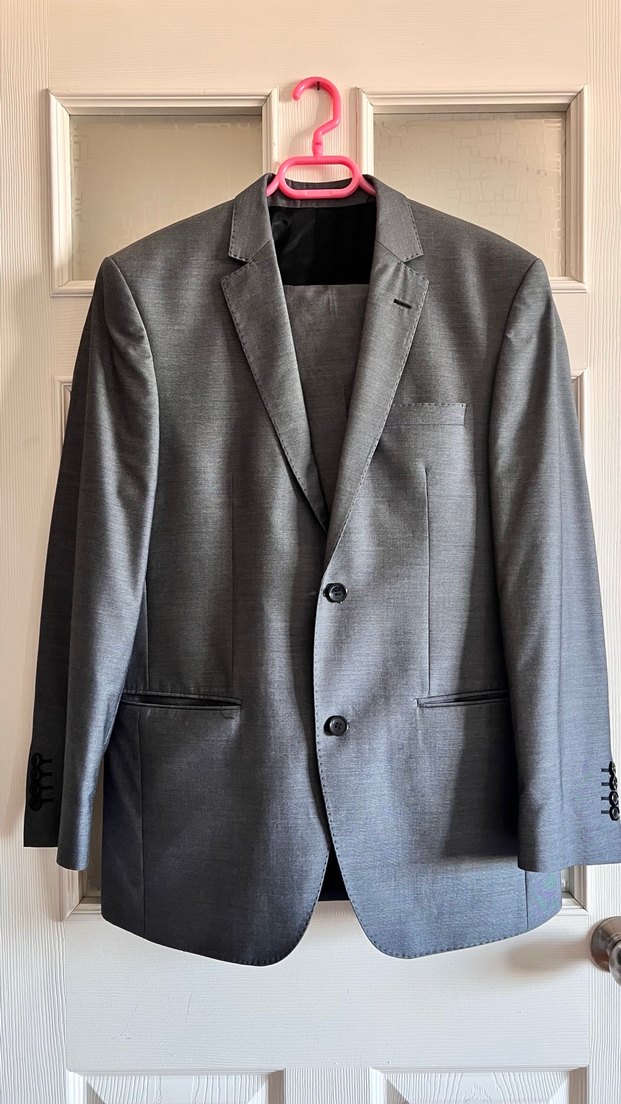 Gri renkli, klasik modern stilde, normal boyda ve düğmeli erkek takım elbise. Notch yaka ve uzun kolludur, ofis kullanımı için uygundur. Bir kere nişanda giyilmiştir.