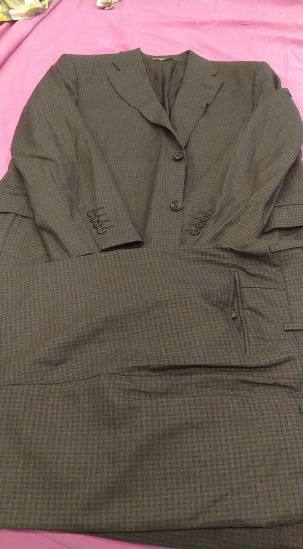 Gri renkli, düğmeli ön kısmı ve kırmalı yakası olan erkek takım elbisesi. Ofis kullanımı için uygun, klasik ve uzun kollu model.
